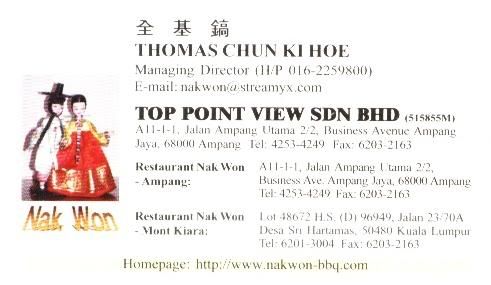 老兄,之前我在MONT KIARA吃的韩国烧烤也不错。忘了什么名字。不过那里的空气流通很好。。。。。泡菜就有20种(已经是PACKAGE了,不管你要与否还是CHARGE了)。。。