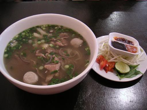 牛肉粉以米浆制成,加上不完全熟透的牛肉和生豆芽,香菜,薄荷等,汤味清甜,和平常吃的牛杂粉无多大分别,只是牛肉片是生的,削薄后以热腾腾的牛肉汤把牛肉烫至半熟,吃时再配上生豆芽,酸柑汁和甜辣酱等一起吃.