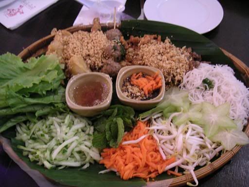 宾海,越南语是Banh Hoi,其实就是一个大拼盘,喜欢吃什么,就自己亲自配菜,一个大拼盘內有春卷,鸡扒,烤猪肉片,蔗虾,猪肉丸等,蔬菜則有豆芽,薄荷叶,生菜,红萝卜丝,杨桃,黄瓜及银丝米粉,十多种配料任君配搭.然后再用越南春卷包起,沾甜酱或鱼露汁吃,是越南人的传统吃法,也是越式小食的最佳卖点.