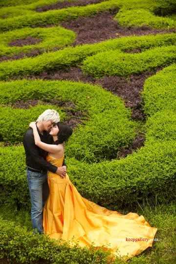我也觉得是哦, 白纱让我看到很胖 . 那时刚下完大雨, 场景有限, 摄影师看到桌子就叫我上去咯 . 很可惜不能拍我们躺在草地的照片..