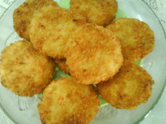 5.用手把马铃薯泥搓成球形,然后压一压,再蘸面粉,然后,蘸上蛋汁,再蘸上面包粉。