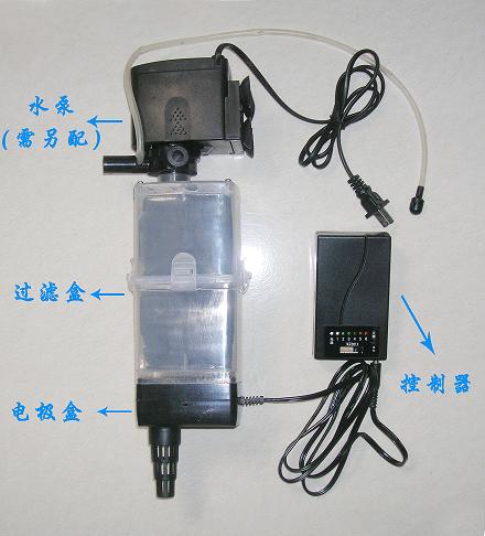 答:净水机在缸内分三部分:水泵、电极盒、过滤盒,按照这个顺序上中下插接到一起,必须全部侵入水中靠水泵后面的吸盘吸在鱼缸壁上。控制器在缸外插电源连接控制电极盒。