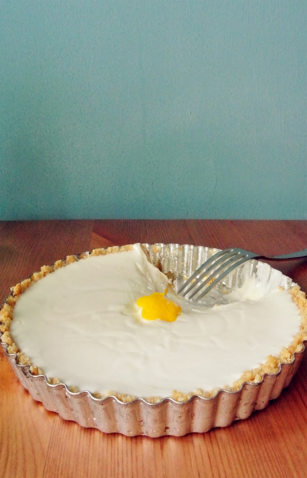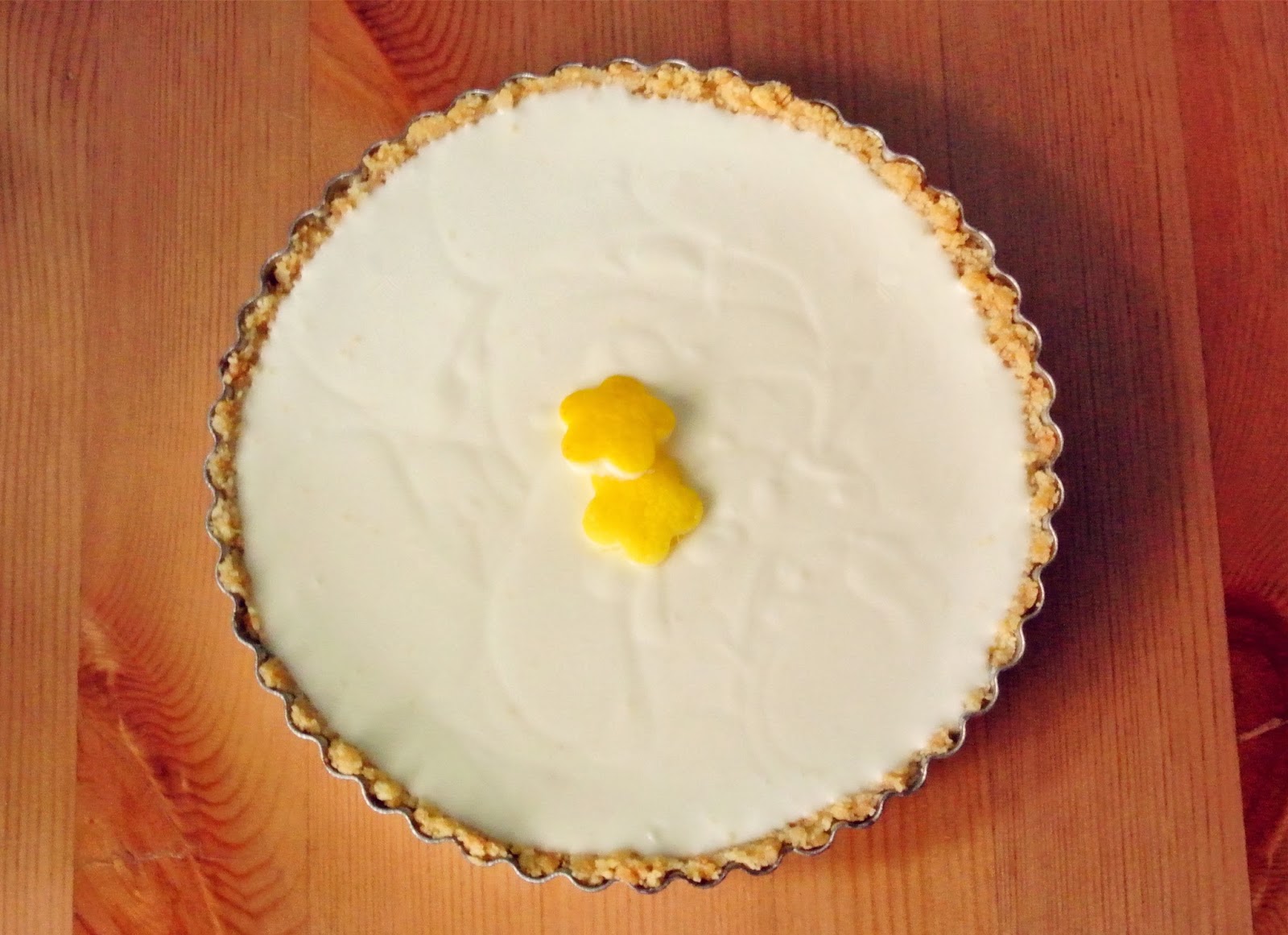 4。把摊凉的3混合物均匀地倒在1。里,用剩下的酥皮切成一条条约宽1cm的面条,在派上排成如图的交叉状。(我还压了个心型放在最上端♡♡