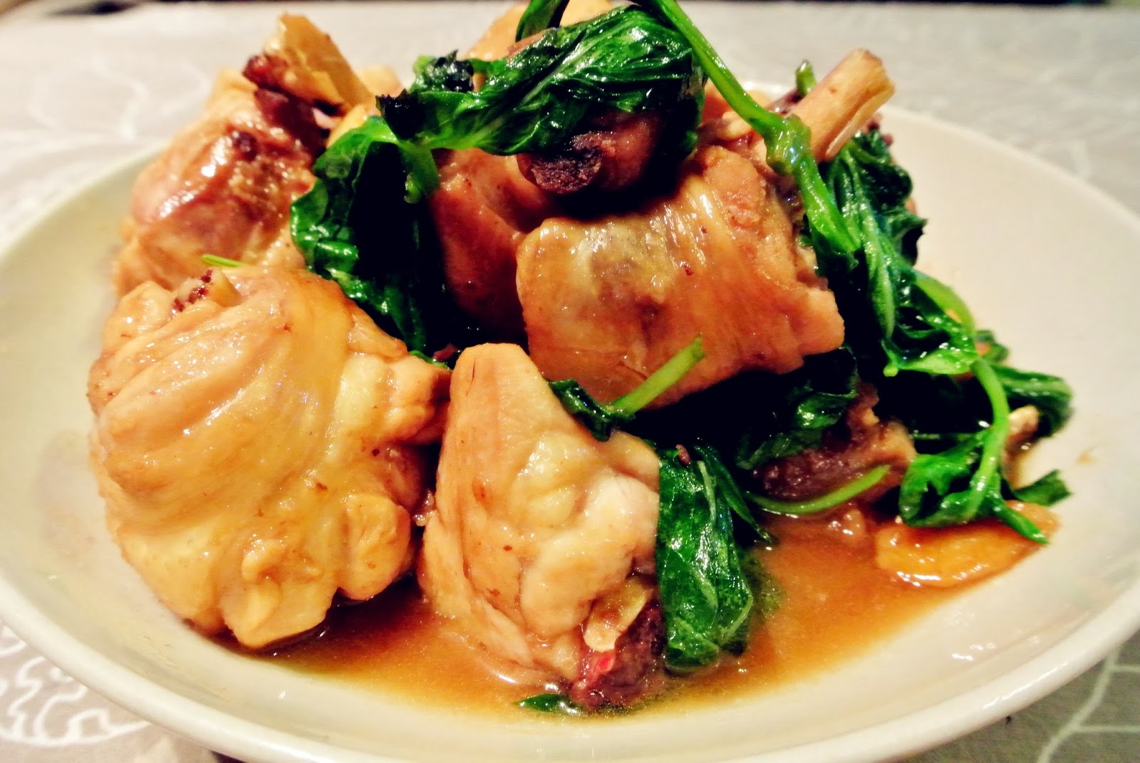 材料: 九层塔叶1把,鸡肉块400-500g,蒜头5-6颗,小红葱3-4颗,姜片3-4片,麻油适量,米酒半杯,冰糖少许,酱油适量。