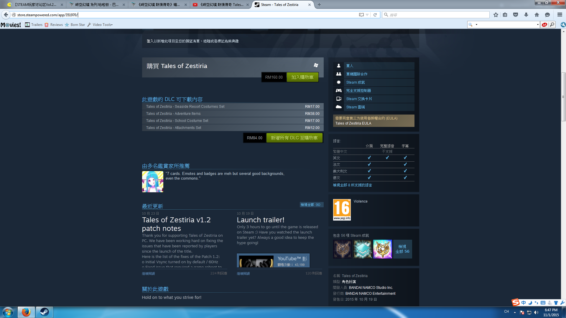 抱歉,請問一下這款遊戲 Tales of Zestiria , steam 有中文嗎?