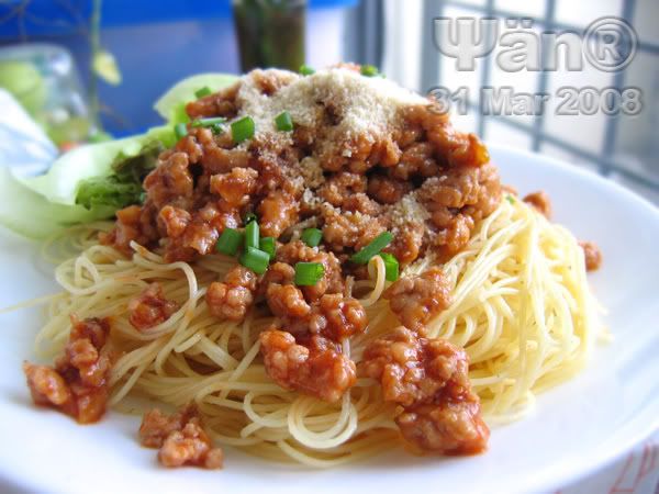 蒜茸+免治猪肉+黑胡椒+mixed herbs+糖+ 盐+ 番茄酱+意大利面=