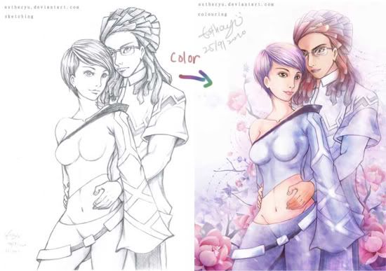 动作感觉生硬,还得多参考模特儿杂志。最大败笔是男生的手指被画得很用力的放在女生身上,哈哈,不够温柔。手指的确很难掌握,加油!! |