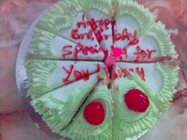 我看这你,心里有着说不出的感觉,我看见你为我做那么多事,心里真的很感动~我吹了蜡烛,然后下楼切了蛋糕,打算分给朋友们吃。怎知道朋友们都怪他唱生日歌不叫他们,又补唱了一次。。。。虽然蛋糕已经被我们"分尸"了!哈哈!