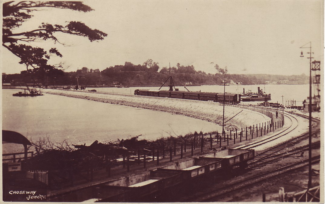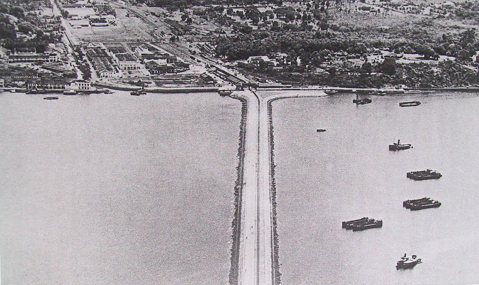 右图:左方为旧时的关卡;中间就是纱玉河;右方的店屋已拆除,现在为Maybank的那排店屋。图片的后方为新柔长堤和新加坡。 |