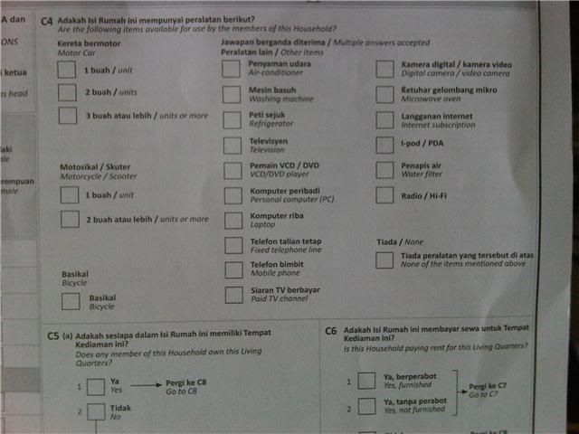 刚刚来了两个人女的,问的很详细,起先很没安全感的回答,问有没电视、车、摩托、洗衣机、电冰箱、streamyx、laptop、年龄、出生年月日、婚姻状况、收入、学历、主修科目、工作地点~~详细到离谱 |