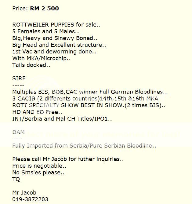我不知道那里找野猪 ... 请问前辈, 有何 “策谋” ? 看见人们多 Rottweiler 价钱的 “要求” 真的灰心 ...