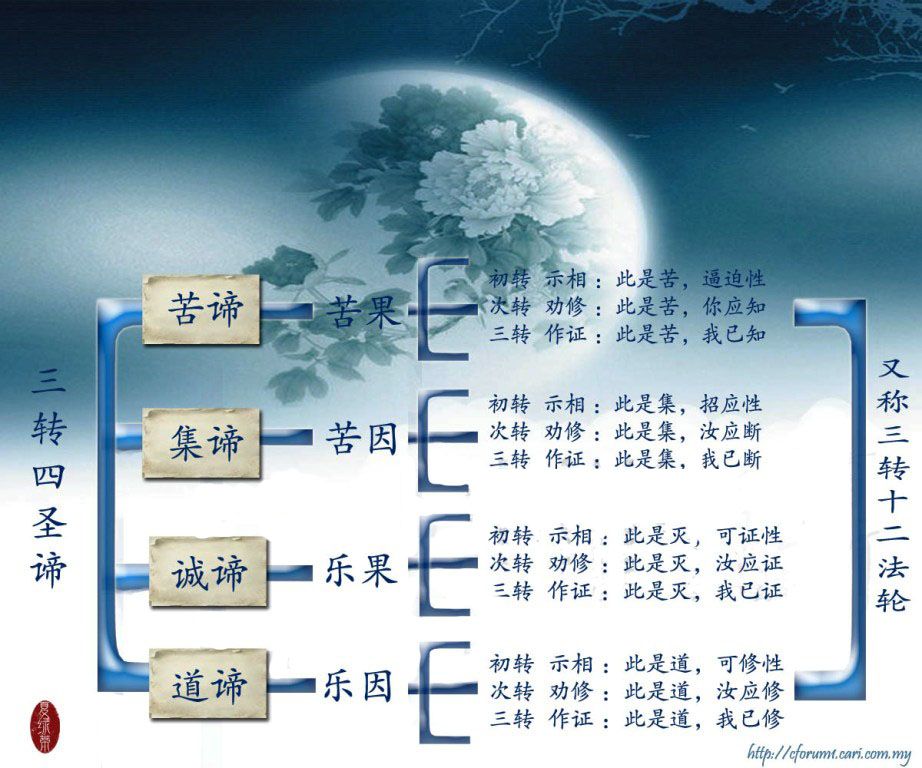 (三) 证转法轮:说明此苦的道理我已知,此集我已断,此灭我已证,此道我已修.这是佛陀初转法轮的一个重要内容,对于苦、集二解释,是一切法都是因缘聚合而,也就是十二因缘法. |