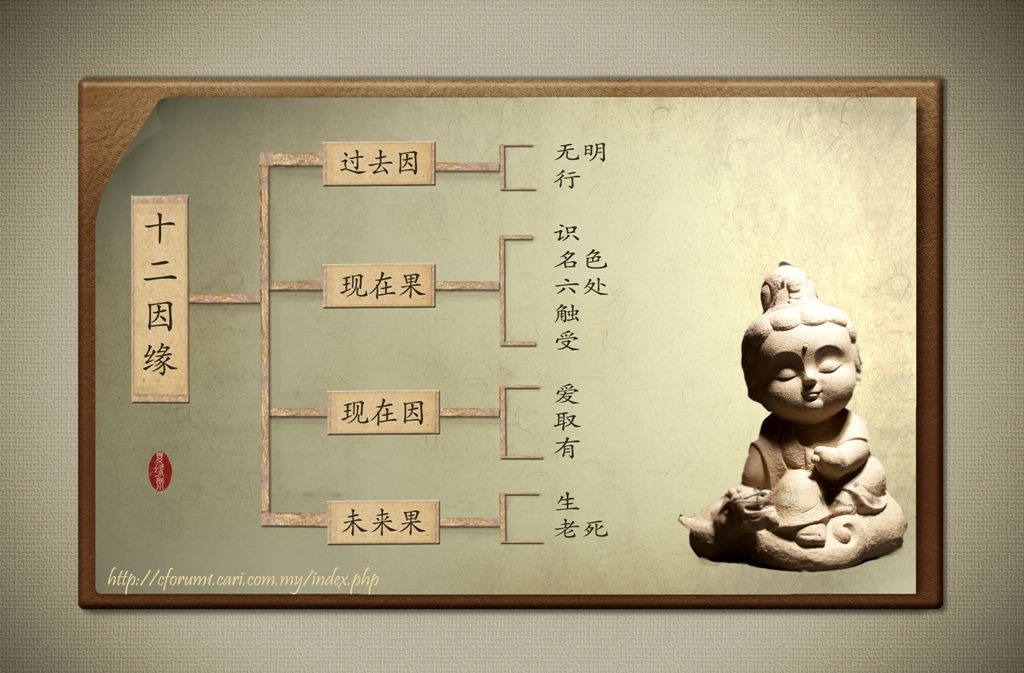 4.緣覺乘:以十二因緣法門為乘,運載眾生越於三界,至無餘涅槃而成辟支佛。世間一切法皆為緣起,緣起的定義是:「此有故彼有,此生故彼生;此無故彼無,此滅故彼滅。」這是說明一切法的存在,有彼此相依相待的關係,都是從因緣而起的。有情眾生生死流轉皆不出此緣起法。