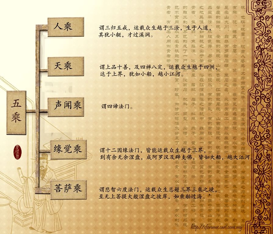 5.菩薩乘:以悲智六度法門為乘,運載眾生,總超三界三乘之境至無上菩提大涅槃彼岸。六度為布施、持戒、忍辱、精進、禪定、般若。
