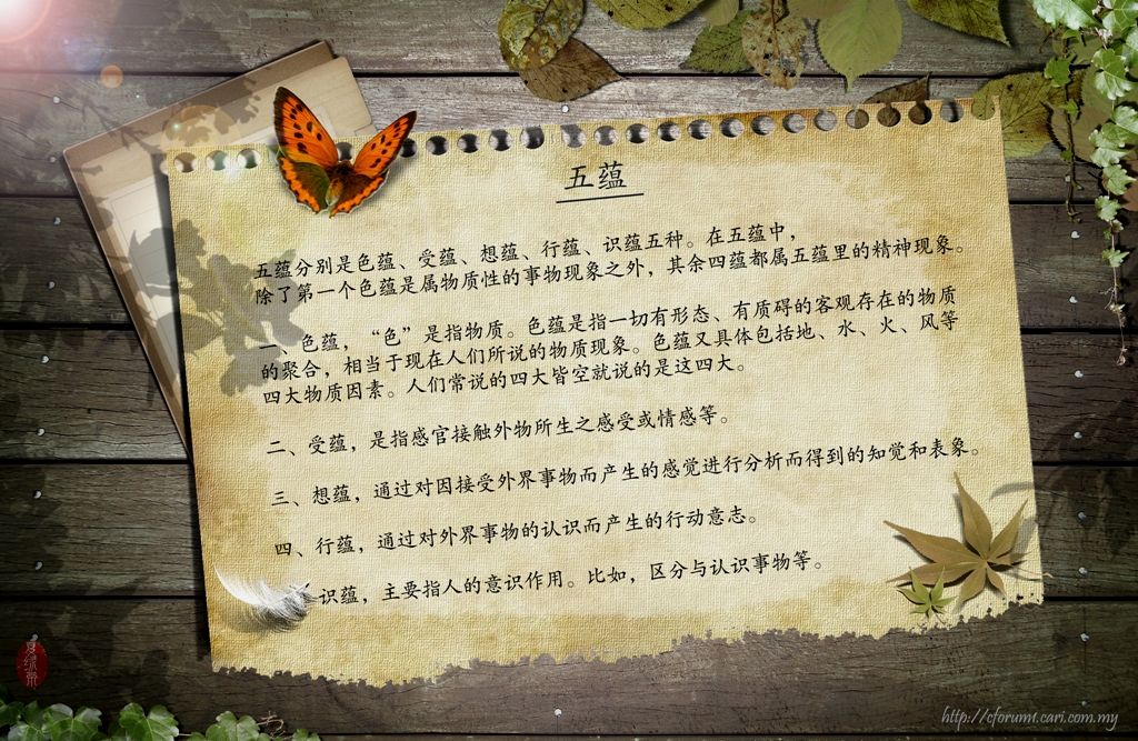 五蕴的“蕴”是梵文的音译,意义是积聚或者和合。佛教认为世间一切事物都是由五蕴和合而成,一人的生命个体也是由五蕴和合而成的。 |