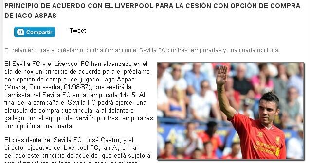 西甲球队塞维利亚在官方网站上宣布同利物浦就阿斯帕斯的加盟达成协议,西班牙本土前锋将以租借的形式重返西甲联赛效力,而双方的合同中还加入了买断条款。