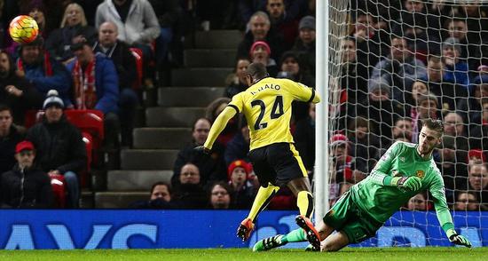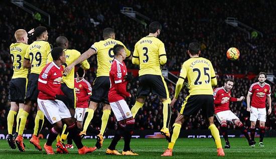 2015/16赛季英超第28轮一场焦点战在老特拉福德球场展开角逐,曼联主场1比0小胜沃特福德,马夏尔疑似假摔造任意球,马塔第84分钟绝杀。曼联主场3连胜,积分追平少赛一场的曼城。 曼联近10次对阵沃特福德取得全胜,沃特福德上次击败曼联还是1986年,历史上唯一一次客胜曼联还是1979年联赛杯。双方历史交锋25场,曼联16胜5平4负优势明显。马夏尔伤愈复出,拉什福德继续首发,门萨轮换出场。 曼联开场后逐渐控制比赛,马塔左路传中,霍莱巴斯小禁区边缘解围险些自摆乌龙。随后埃雷拉战术角球左路斜传远点,马夏尔小禁区右侧边缘的小角度头球攻门打在边网。伊格哈洛禁区边缘的射门被布林德挡偏出左侧立柱。德佩切入禁区左侧的射门离谱偏出边线。布林德后场传球失误,伊格哈洛禁区边缘外操之过急浪费机会,他的低射被德赫亚轻松没收。 沃特福德解围角球,施奈德林25码处半凌空抽射擦左侧立柱偏出。随后伊格哈洛突入禁区被门萨漂亮铲断。普罗德尔混战中禁区边缘内凌空扫射偏出。沃特福德第27分钟再次险些破门,卡普埃左路传中,迪尼头球摆渡,伊格哈洛10码处转身低射,皮球擦左侧立柱偏出。伊格哈洛禁区右侧的射门被扑出。布林德再次回传门萨失误,但德赫亚及时出击化解险情。