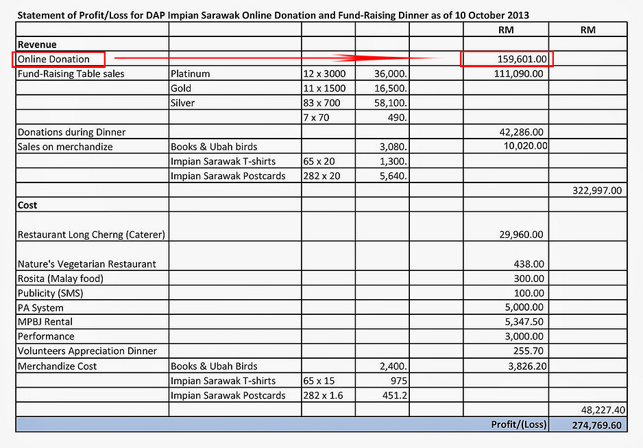Tapi maklumat dalaman mengatakan DAP mengutip setinggi RM 3,000,000.00 (RM3juta) hasil dari sumbangan pembelian meja dan kutipan derma meja ke meja untuk majlis Fund Raising Dinner dari tahun 2011 sehingga sekarang. (jumlah termasuk kutipan derma untuk pilihanraya).