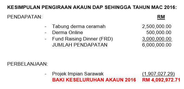 Jawapan DAP amat mudah: “Semuanya kami belanjakan untuk membantu rakyat dalam projek Impian Sarawak. Kami ada memaparkan semua kos perbelajaan itu di laman web Impian Sarawak”