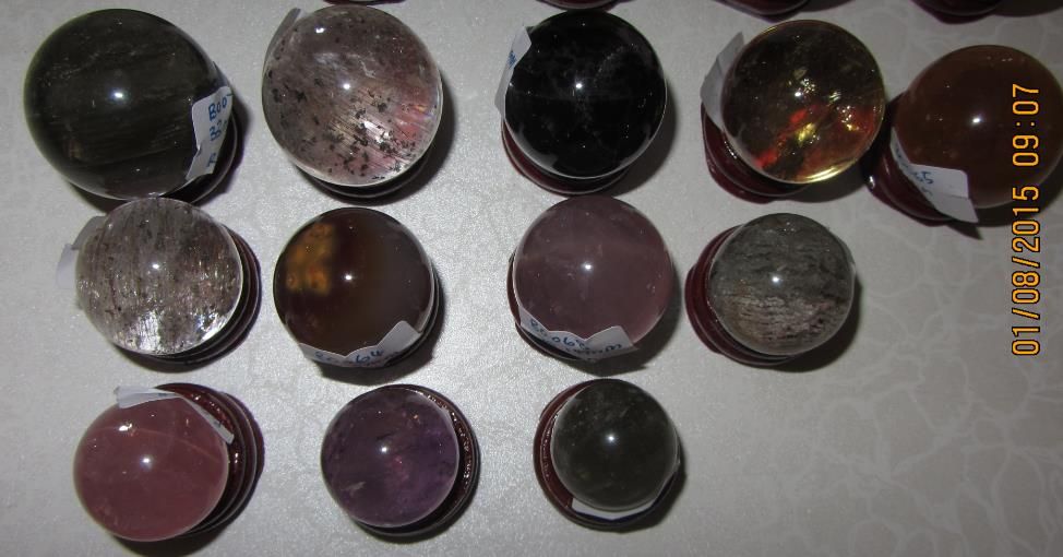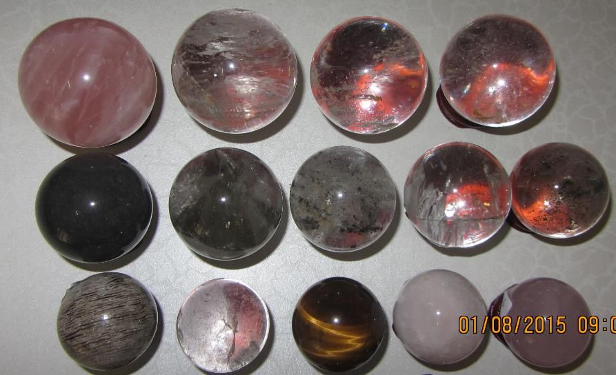 你好!有约30 mm++的虎眼,金耀石,彩虹黑耀石和粉晶的晶球。