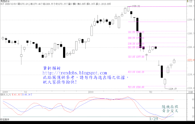 因此,自農曆年假結束後,綜指持續反彈並突破壓力1268點。週一綜指的走勢為『再攻擊』,而後一路呈現『日出』攻擊,直擊1268點壓力且滿足費氏數目標1276點。以反彈的觀點看來,綜指已呈現強勢反彈,而隨機指標之KD值亦超過80。