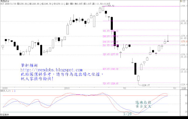 延續上週的看法: 缺口過大(缺口壓力為1265點),除非發佈非常樂觀的利多消息讓綜指狂漲20點左右,否則綜指應傾向先盤底再挑戰缺口壓力。