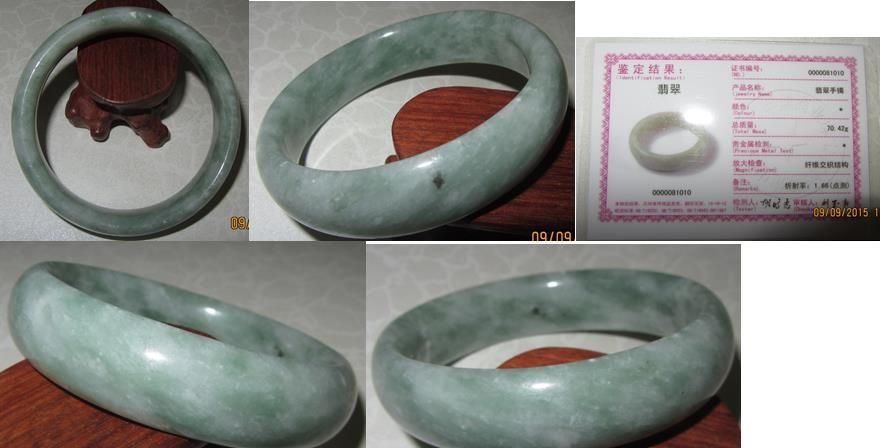【手镯 : 天然翡翠 纯A货 附鉴定证书】 -------------------------------------------------------------- 规格 : 内径59mm ,面宽16mm , 厚约7.7mm 价格 : RM93 (未含邮費) Code : A0403