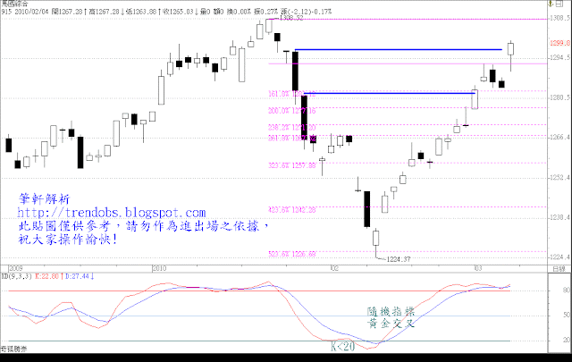 本週週線已突破中線壓力1298點。下週為空頭抵抗週,應提防空頭趁勢強攻,導致強回的現象。若無此現象,暗示多頭極強,再創高的機會則大大增加。