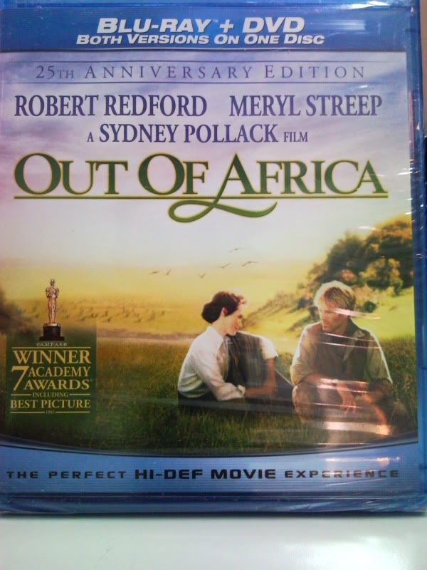 然后就是远离非洲-一举拿下7个奥斯卡小金人的片子了。我在1989年才有缘在家音像出租店看过,从此以后念念不忘,收过VCD,DVD,现在收Bluray。片子充满了浓浓的殖民时代味道的非洲,那种风情煞是特别,现在这种调调的市内装潢只能在如east india,british india,或者Ralph Lauren类似casablanca般的时装店里才能看到了。从图片里看,这张disc是个一面bluray另一面是DVD的东西,还满好玩的.