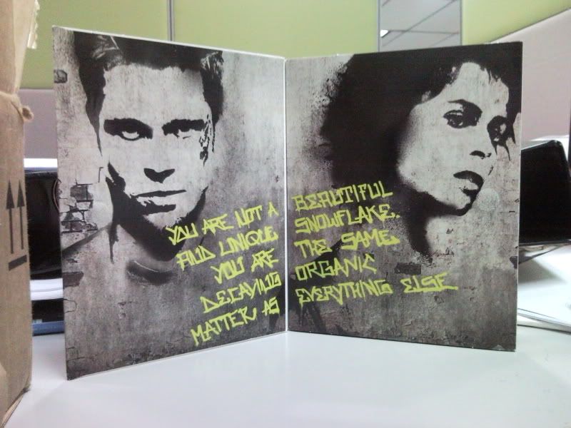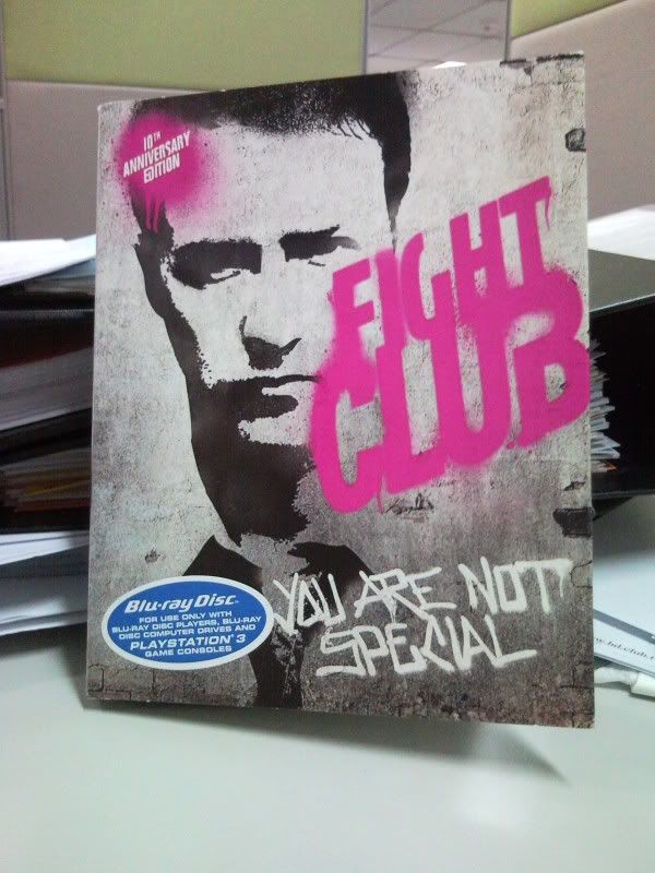 接下来也是一部看了后也久久不忘的电影了-fight club。当时也不知道自己为什么会对这部片子有那么深刻的印象的。当时是在大学时候看,也说不上个所以然来。后来工作了,重看了DVD,就了解了。不过我用什么来提醒自己是个活生生的人呢?当然不是加入fight club啦(不过大家要记得,fight club的第一条条规就是-不准提到fight club这个字眼哦)。