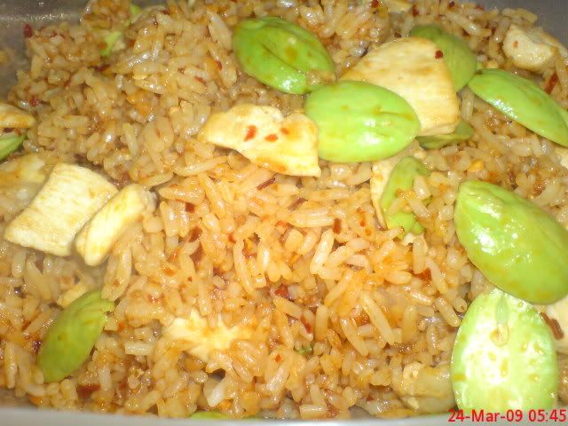 看到很多家的臭豆很BEH TAHAN了,星期六买了到今天晚上才煮,忍不住在5.30AM起来炒了这炒饭当我的午餐.