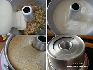 3。倒入戚风模,轻敲几下