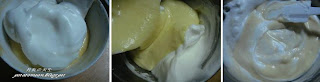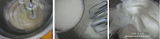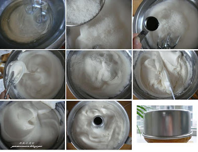 1。蛋白打至起泡。加入塔塔粉&糖&vanilla香精打至湿性发泡