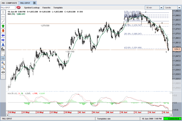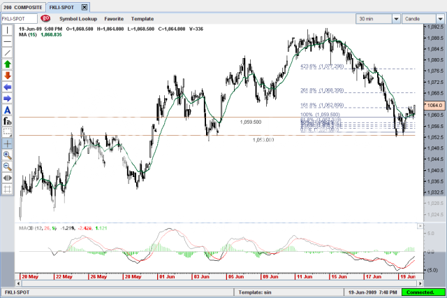 今天跳空向上后来下跌在1053有很强的支撑,到了12pm突破1059.5可以长但MACD零以下和突破15MA不稳定对上升有所保留,还有盈利不是很多不值得冒这个风险,下个星期一支撑点1063和目标价1068 (1068也是满强的阻力).... |