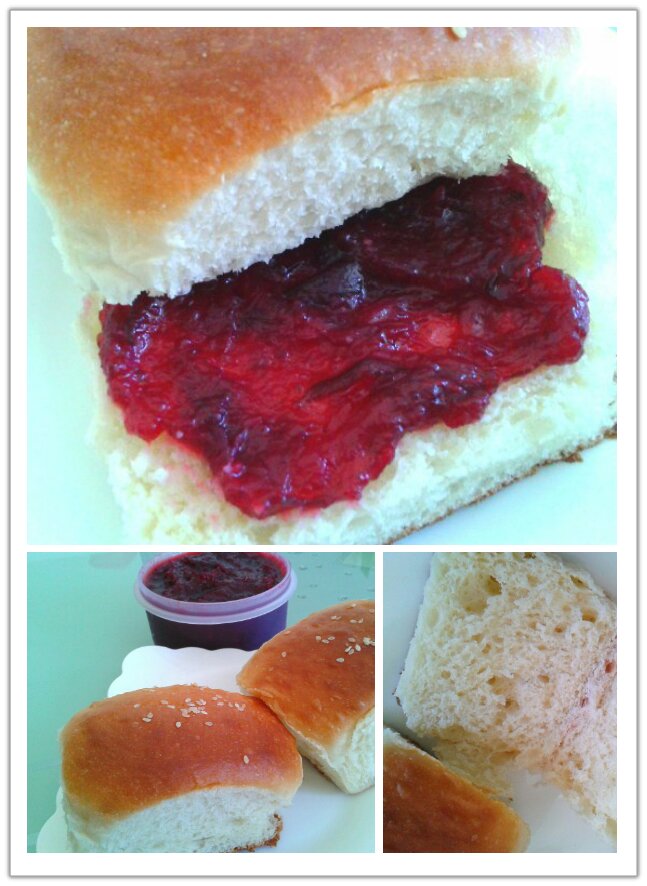 自己做的小餐包,抹上一点洛神果酱,还不错~