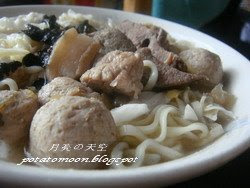 然后花肉和肉丸加入汤里头。熬得差不多就加入内脏