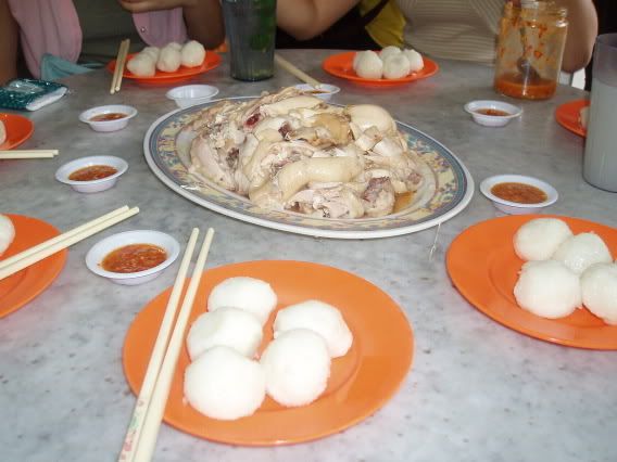 哇!好多人哦!我们在门口等待座位。也不知道过了多久(不久吧?)真是幸运!我们就坐了下来~ 点了一只鸡,然后7碟饭。不久,闻名的粒粒鸡饭就在我们面前了!!