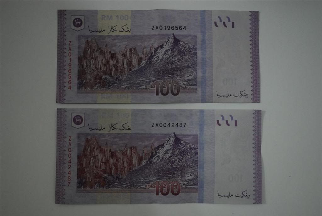 今天從銀行拿錢出來,發現兩張RM100 ZA 補票。 |