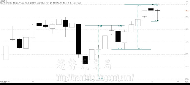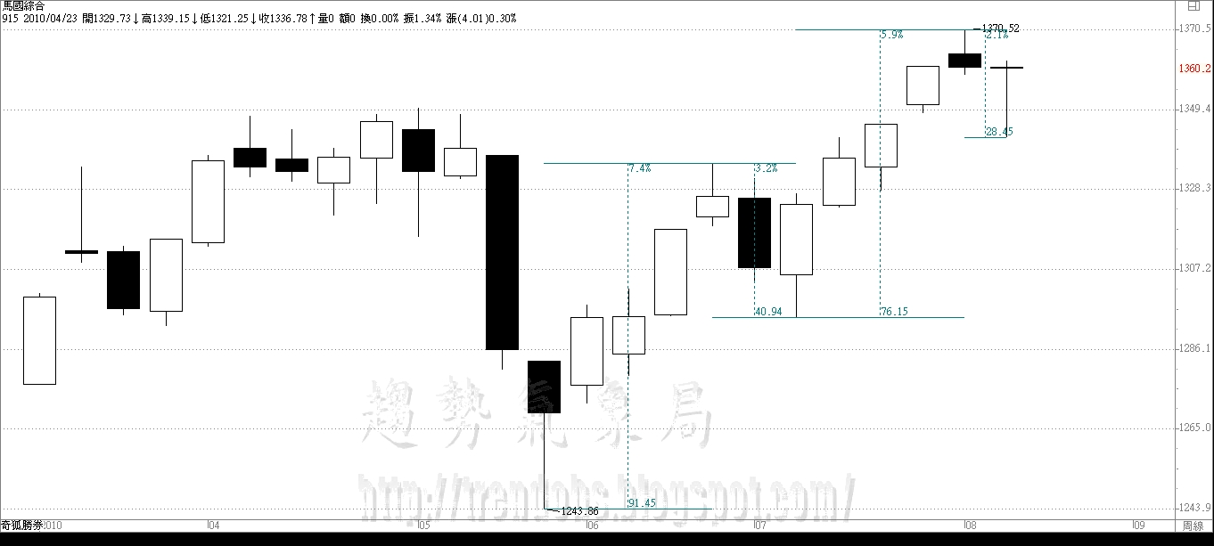 『大馬綜合指數自週一以來一路呈現日出攻擊,直到週四才呈現拉回。但週五再跳空攻擊,最終高開收高形成"晨星"k線組合。然而這個晨星組合撞進了前方的夜星組合,未來一週必然會出現較強的空頭抵抗現象。如果指數能過得了這一個強烈賣壓關卡,還應盡快突破前高1350點做真突破,指數才有機會轉為較大層級的攻擊走勢。』