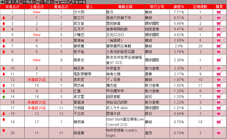 最新一期的taiwan g music 銷售榜成績出了。。。文音以1%之差敗給了黃立行的專輯,只拿了第二  |