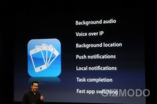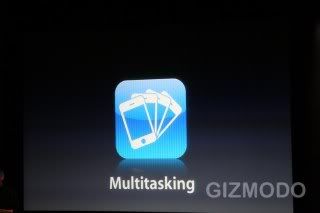 iPhone 一直以来,除了核心的音乐播放、电话可以背景执行之外,其他的应用程式在按下 Home 键回到待机画面时,就会直接被关闭,对于一些需要常驻在背景执行的服务(如即时通讯等)来说很不方便,后来 iPhone 也导入了 Push Notification 来解决部份的问题,但使用者还是希望能有真正的多工能力;因此 Apple 从善如流,在 iPhone OS 4.0 中正式加入了多工功能,只要连续按两下 Home 键,就可叫出背景执行的程式清单。