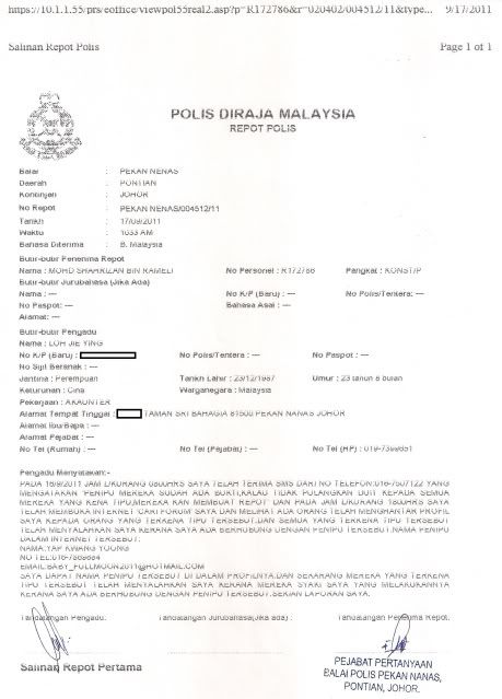这个是我的报案纸!你们凭那一个支付宝充值就认定是我!你们这么厉害,怎么不去找那个Yap Kwang Yoong的资料 ...yingying_Carol 发表于 17-9-2011 11:47 AM