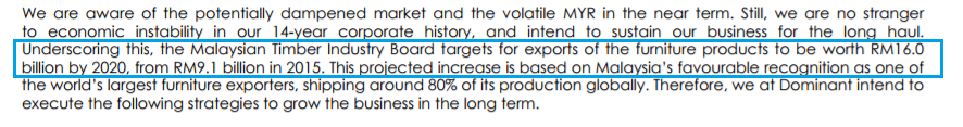 DOMINAN的其中一个目标是把出口营业额增长到20%,过去的3年都看到了明显的增长,FY2017已经增长到18.98%,距离20%的目标已经非常靠近。而且本地和外国的销售都保持稳健的成长,预计FY2018可以突破全年RM600 mil的营业额。