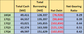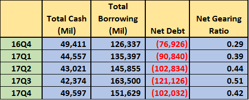 DOMINAN的债务从16Q4的RM126.337 mil一直增长到17Q3的RM163.5 mil,这些借贷都是用在建设扩张新厂。不过大山脚的新厂预计接近完工或已经开始贡献盈利,所以FY17Q4的现金以及债务都了有了非常明显的改善,Net Debt Positon从RM121.1 mil下滑到RM102.03 mil。