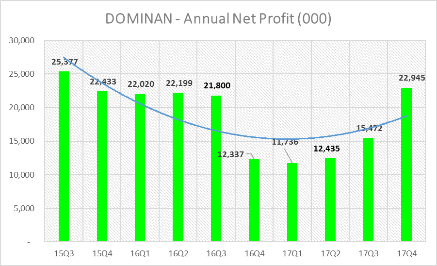 公司的Net Profit在FY2017迎来了U – TURN, 全年Net Profit从17Q2开始复苏并达到历史新高(15Q3包括了一次性盈利)。而且DOMINAN也是为数不多1年4个季度都派发股息的公司,FY2017派发5仙的股息,相等于4%的周息率。