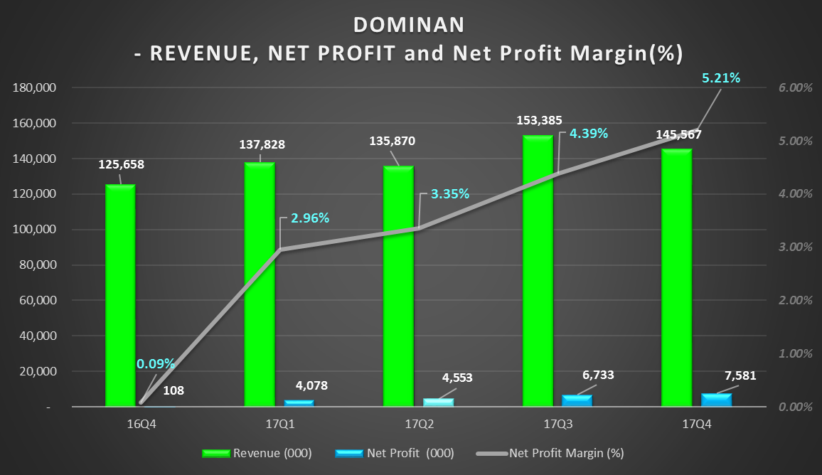 DOMINAN的营业额处于上升的趋势,Net Profit Margin过去4个季度节节高升,而Net Profit已经连续4个季度QOQ成长。