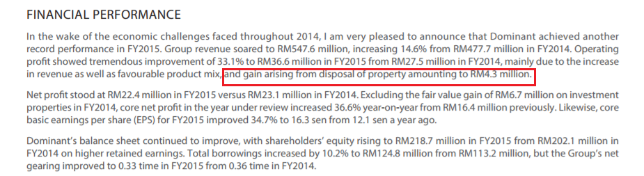 FY2015则是因为卖产业而获得了RM4.26 mil的一次性盈利。