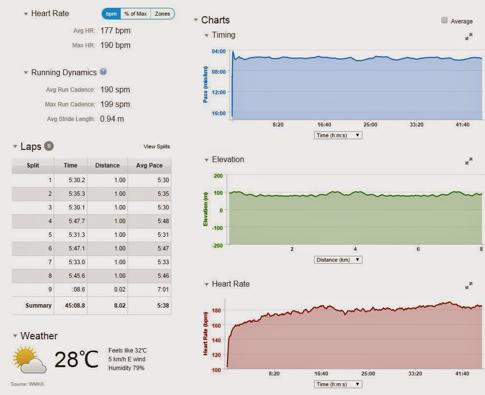 今天跑的感觉很轻松,即时跑得比平时快,但是我不觉得喘,所以没有慢下来。虽然我知道心跳都已经180左右了,但是没有感觉任何的痛苦。当我看到第一个水站时,我才发觉自已已经跑了接近3公里。没有在这个水站补充水分,因为觉得没必要。2KM - 5:47, 3KM - 5:53。
