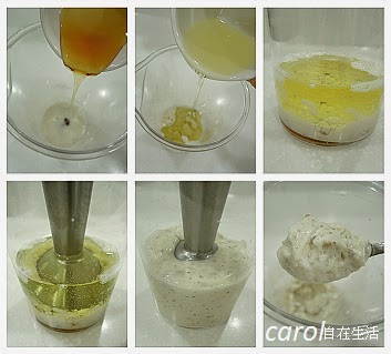 與油脂慢慢乳化成濃稠狀態,再將攪拌棒往上拉繼