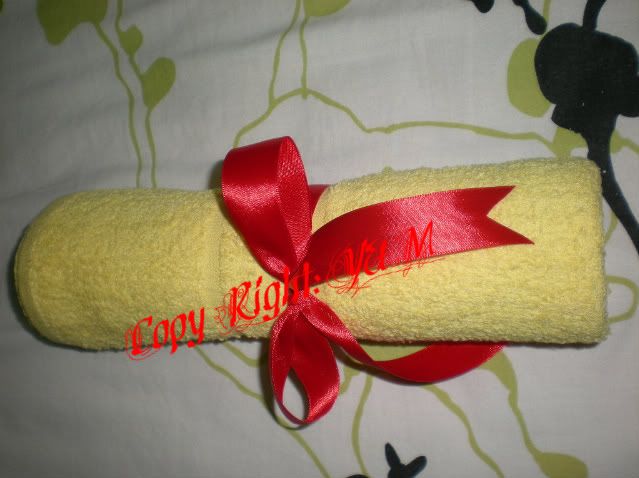 JP说男方敬茶时要给长辈毛巾,所以她陪我去买了大概26条毛巾,是冲凉的那种大毛巾哦!不是那种抹脸的小面巾。过后我自己买红色的ribbon绑个蝴蝶结。。